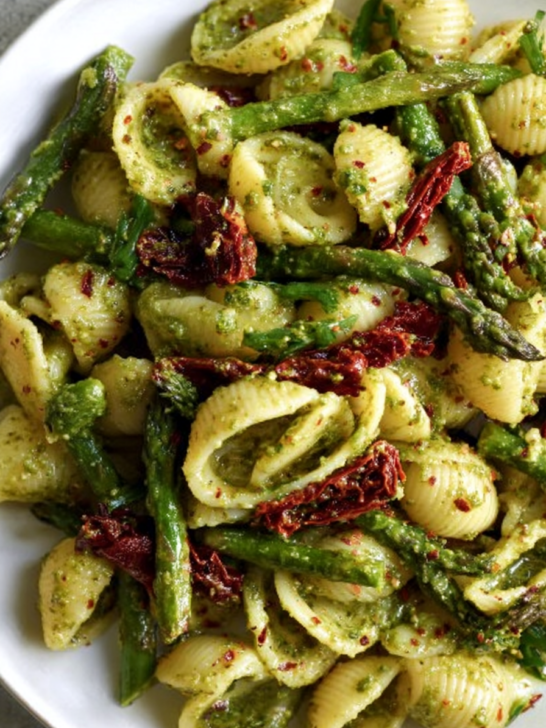 Pesto Pasta with Sun-Dried Tomatoes and Roasted Asparagus